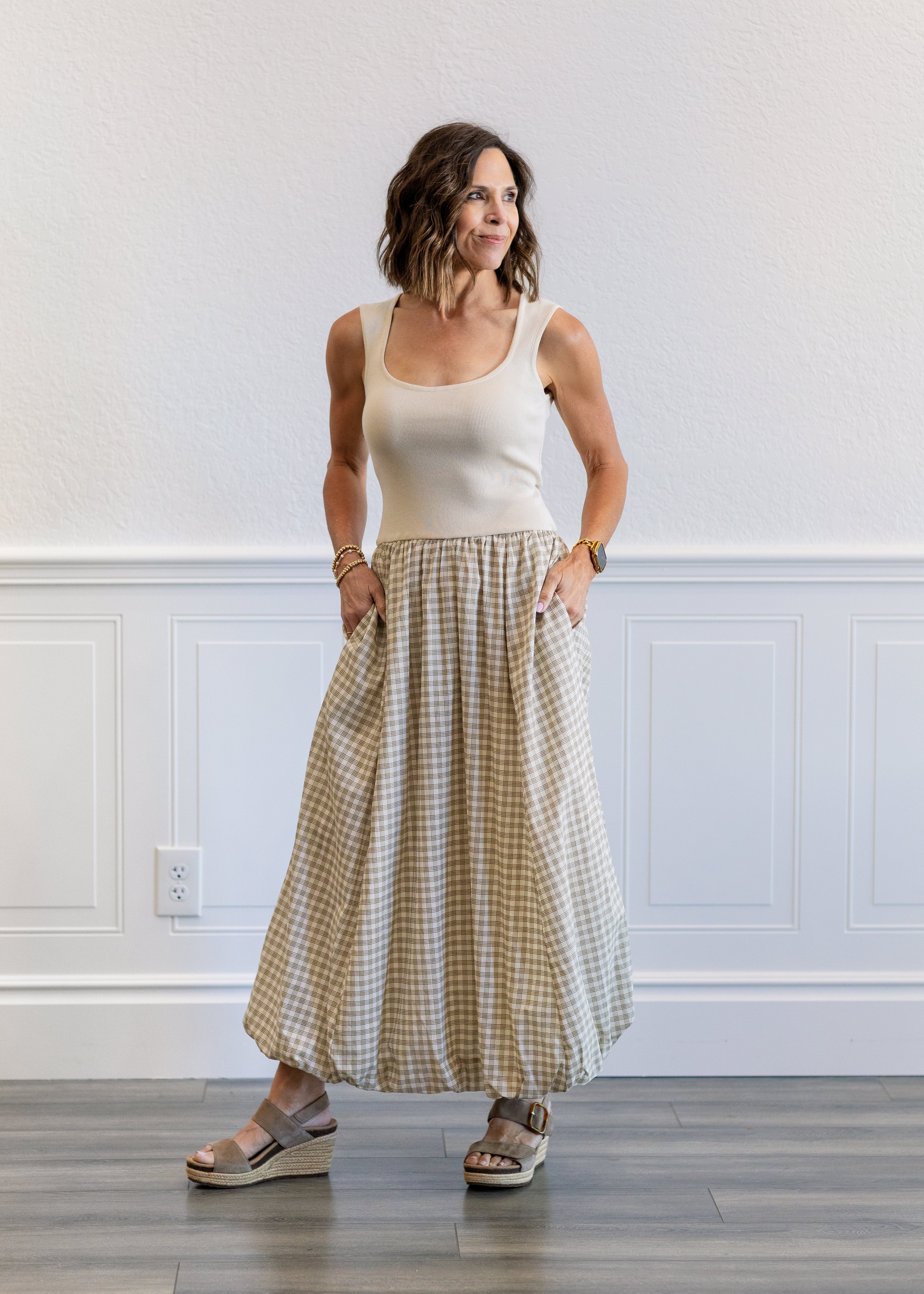 Balloon Plaid Midi Dress in Cream