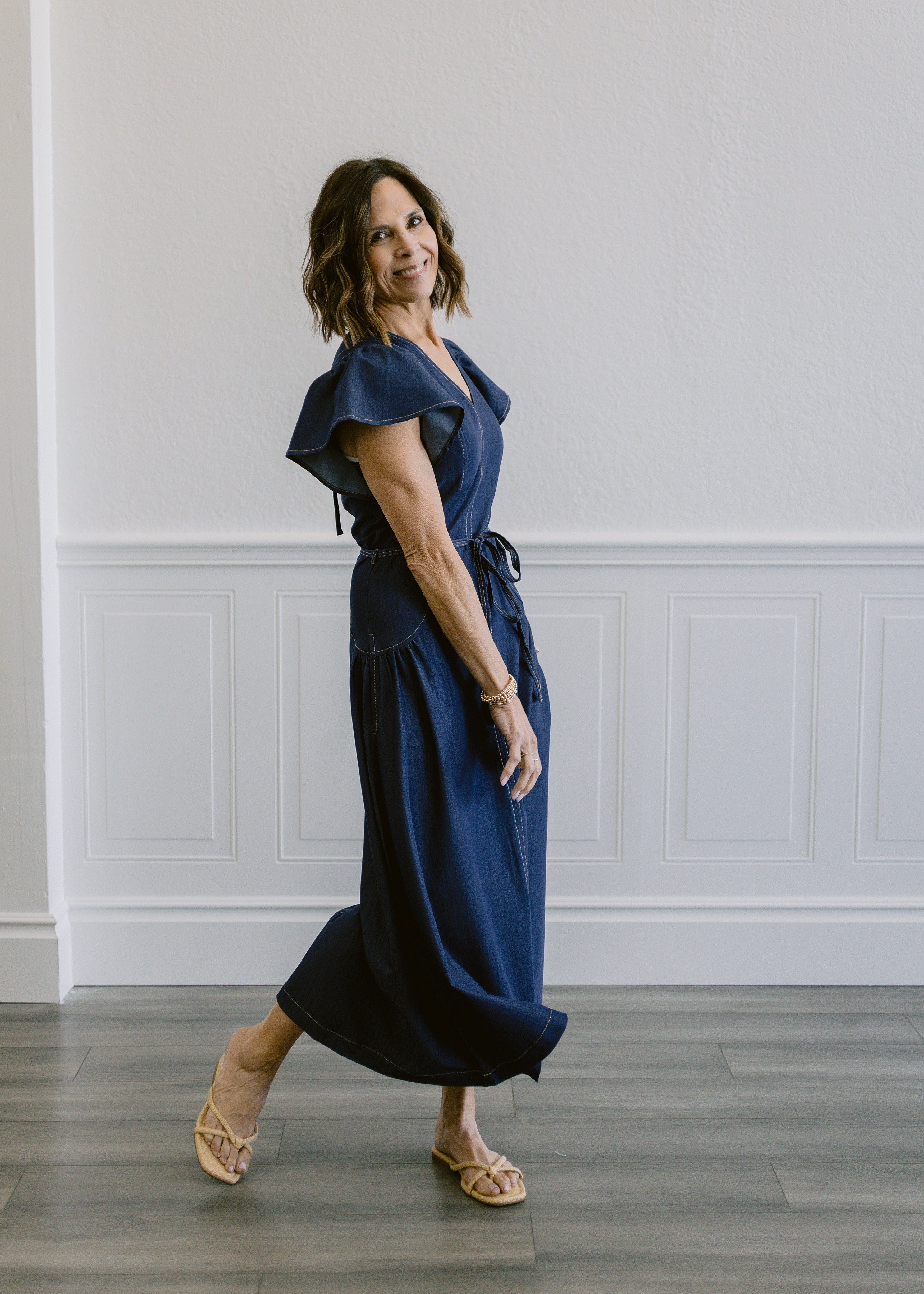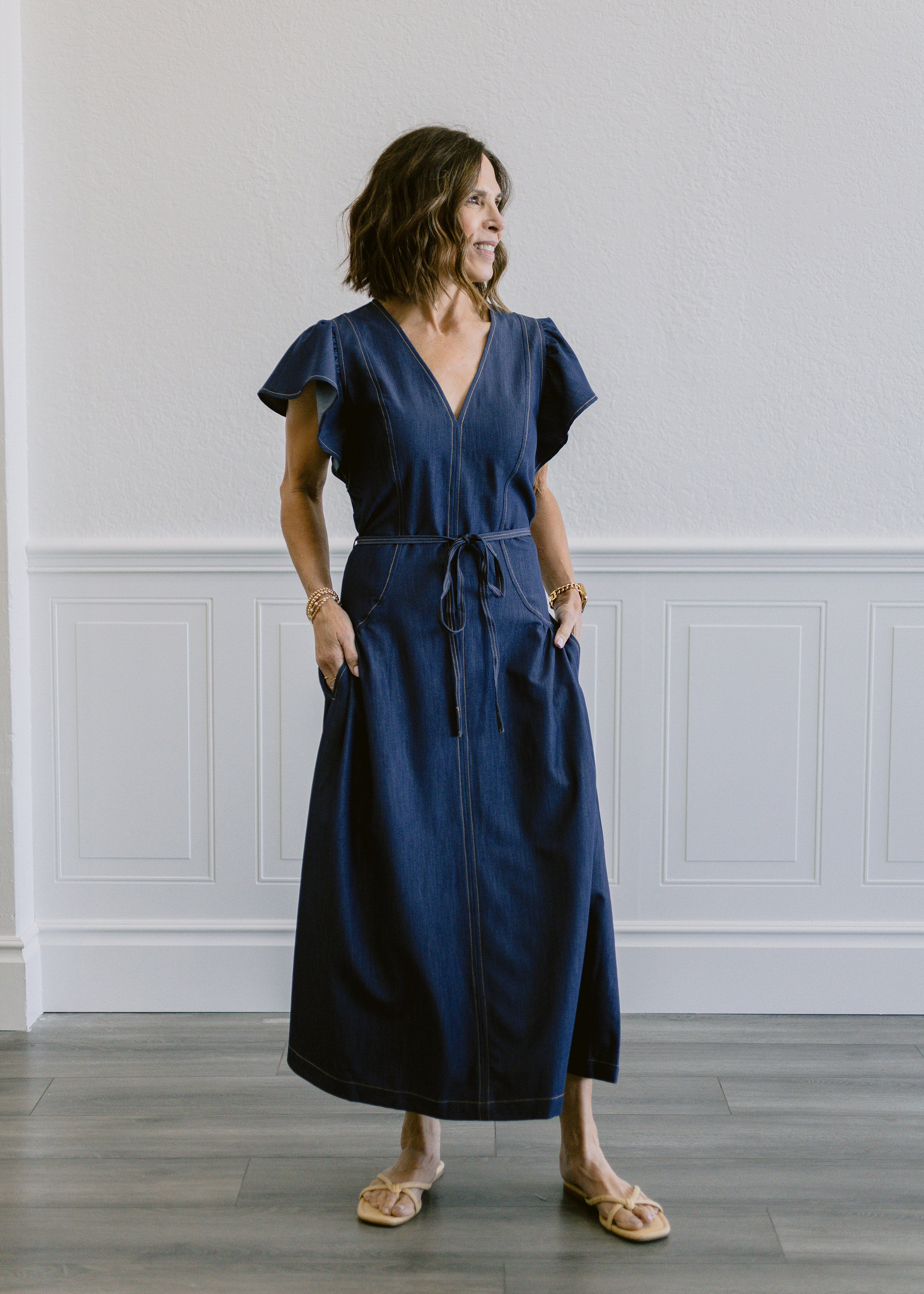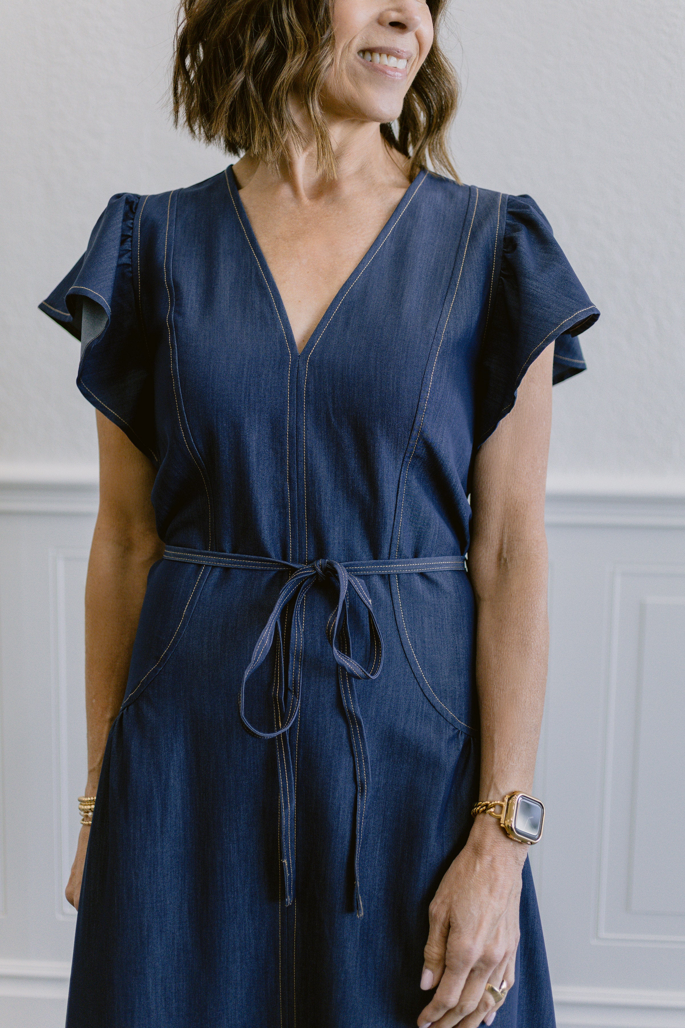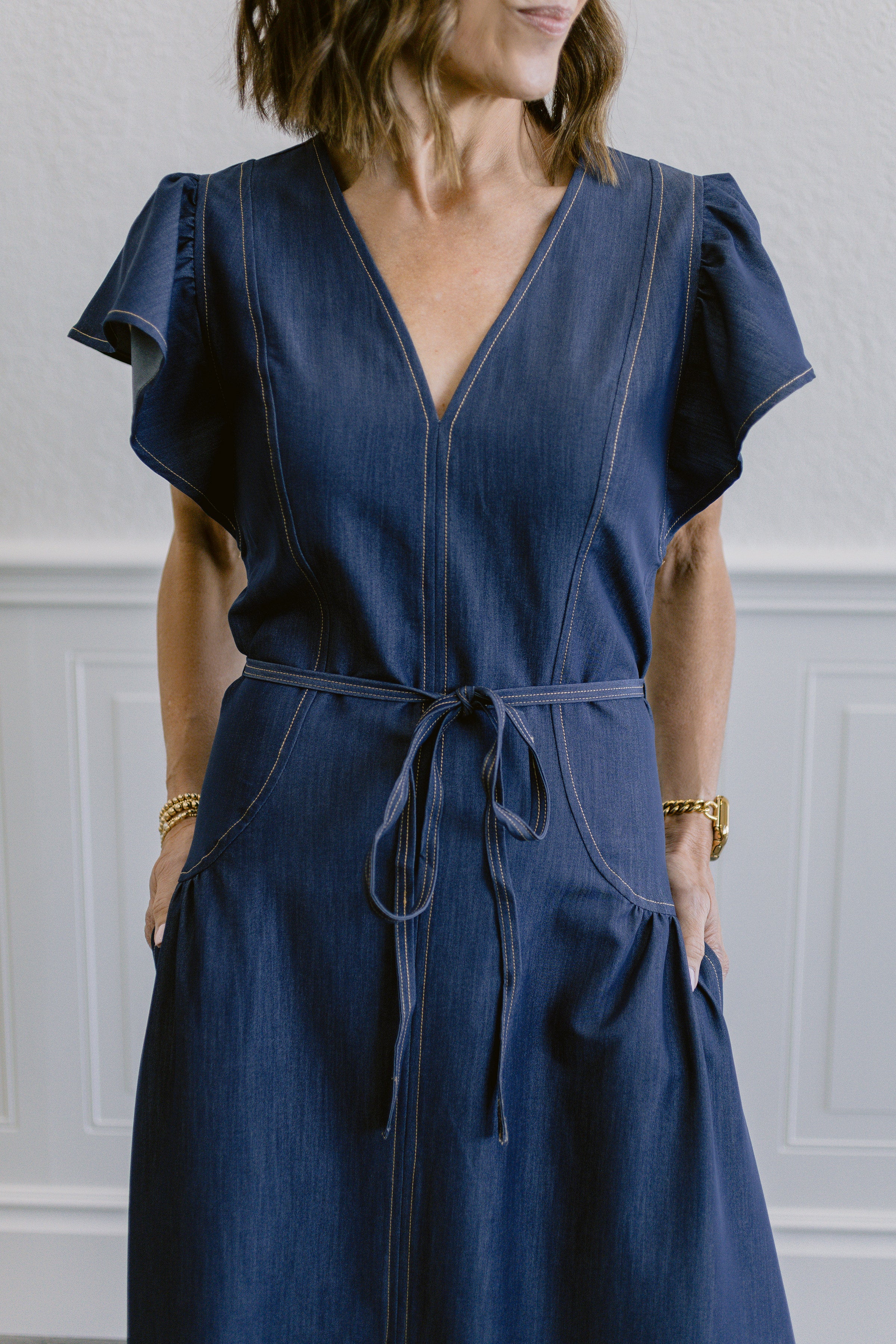 Effortless style meets comfort in this denim washed dress. Featuring a flattering V-neckline and ruffled short sleeves, the design showcases gathered details throughout for added dimension. A self-tie waist belt cinches the silhouette while functional side pockets offer everyday practicality. Care for your dress gently—wash on a delicate cycle in cold water to maintain its beautiful finish.