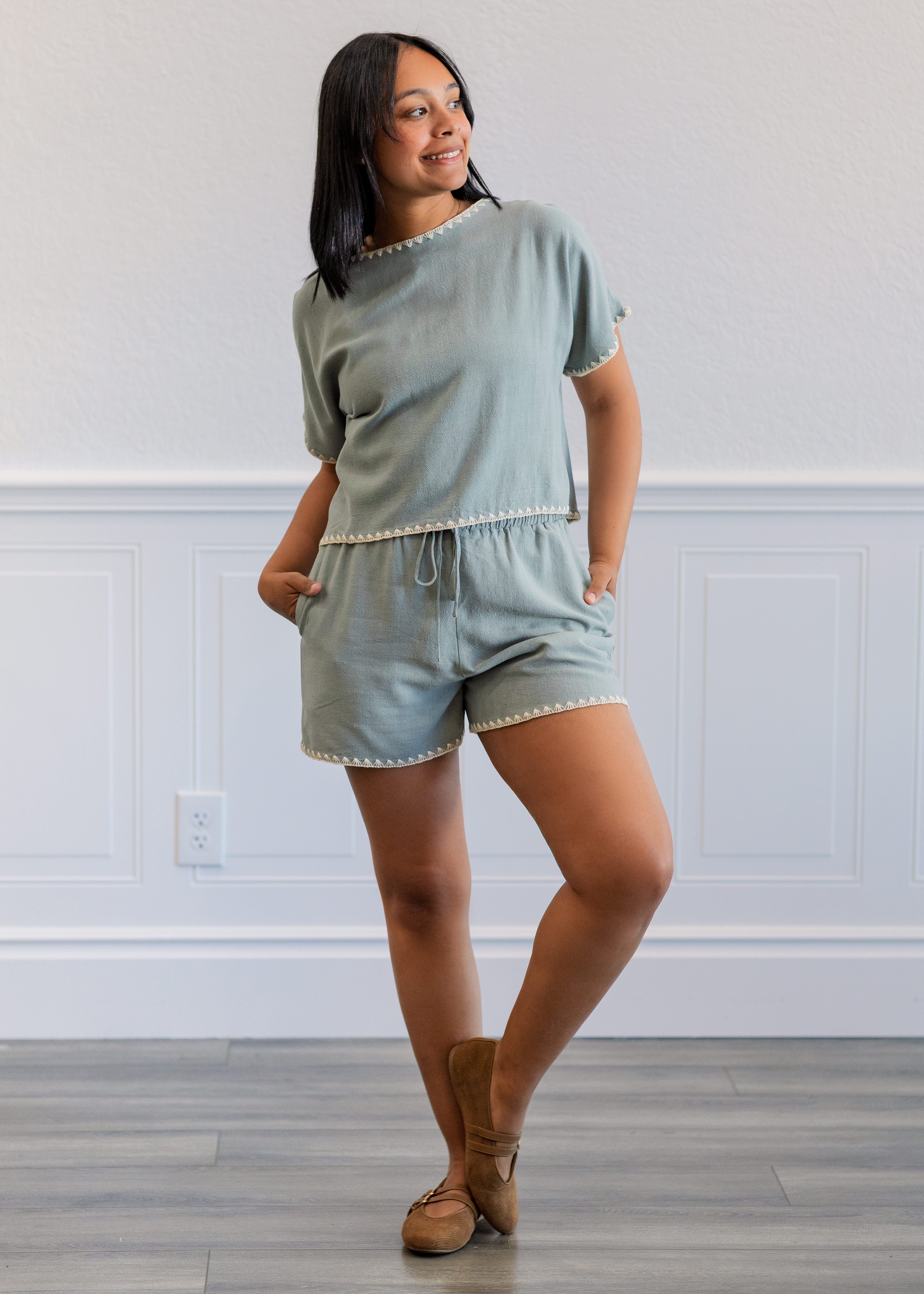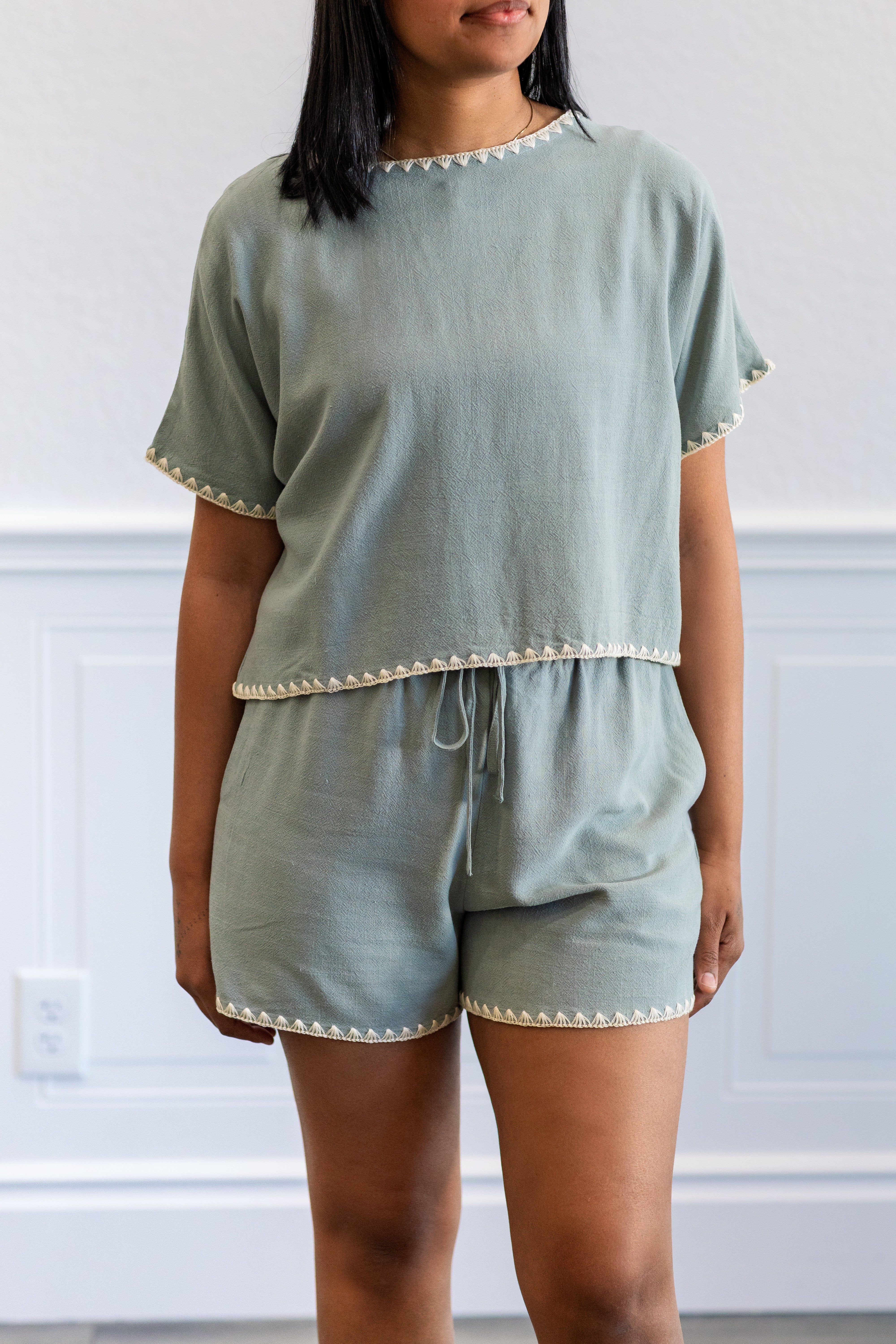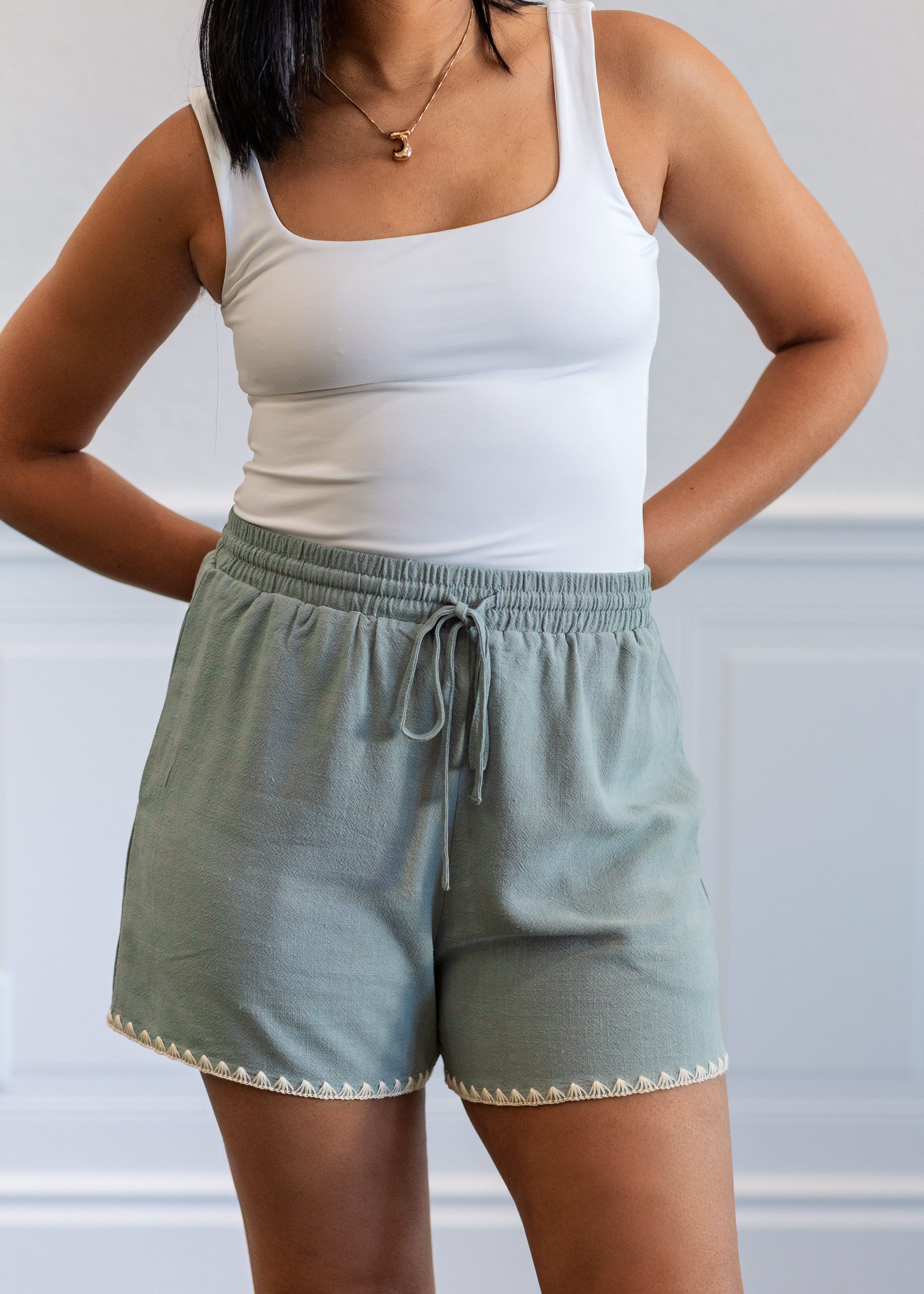 The Soft Linen Blend Elastic Tie Shorts bring together comfort and effortless detail in a warm-weather essential. Designed with a breathable linen blend, these shorts feature an elastic tie waistband for an easy, adjustable fit and a relaxed silhouette that feels light and comfortable. The contrast embroidery along the hem adds a subtle, elevated touch, giving this everyday style a refined boutique finish.