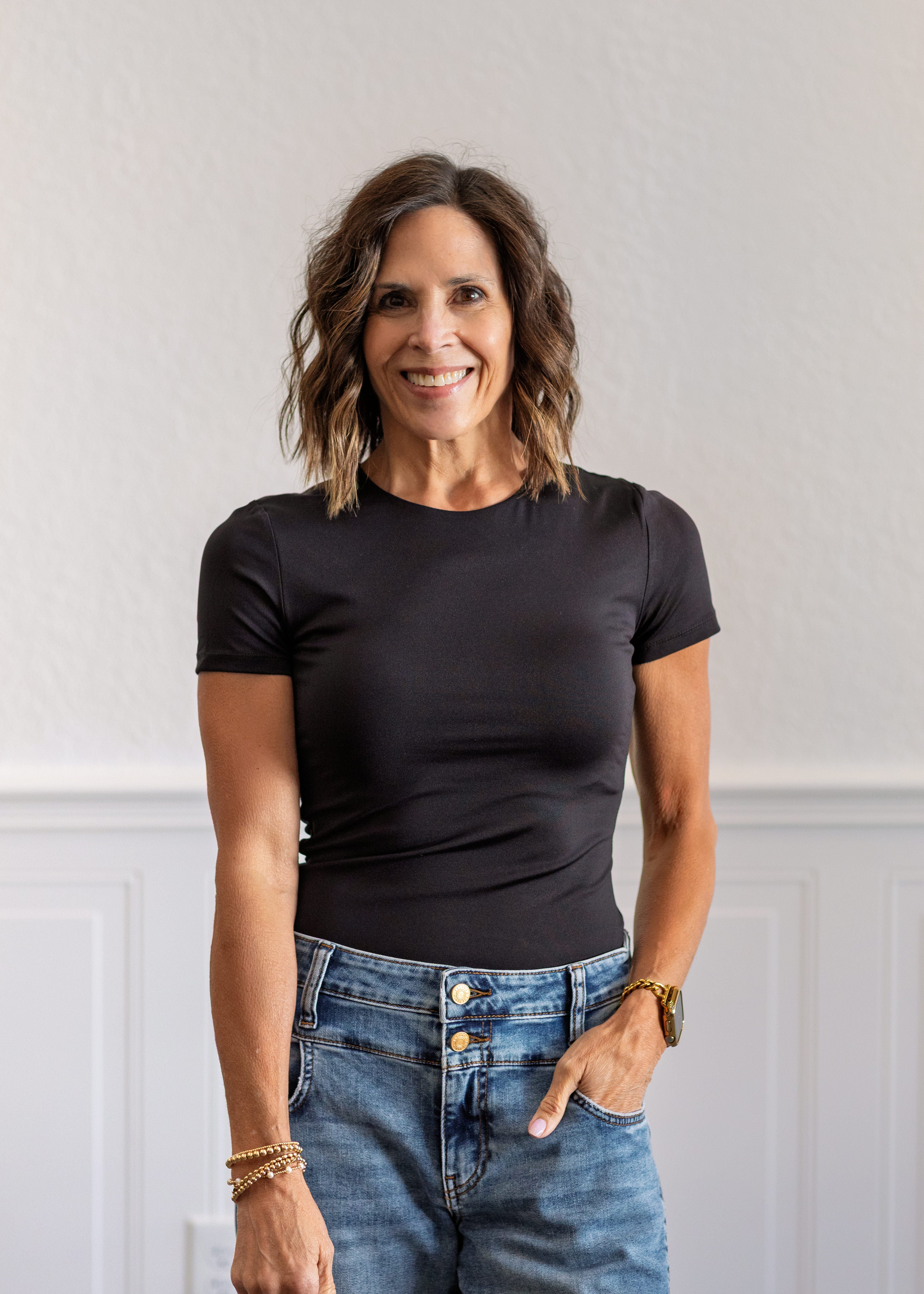 The Roxi Tee is the kind of polished basic that instantly elevates your everyday wardrobe. Designed with a longer length, double-layer fabric, and a high crew neckline, this top offers a smooth, structured fit with the luxe second-skin feel you will want to wear on repeat. The ultra-flattering fabric creates a sleek, smoothing effect while still feeling soft, comfortable, and easy to move in.