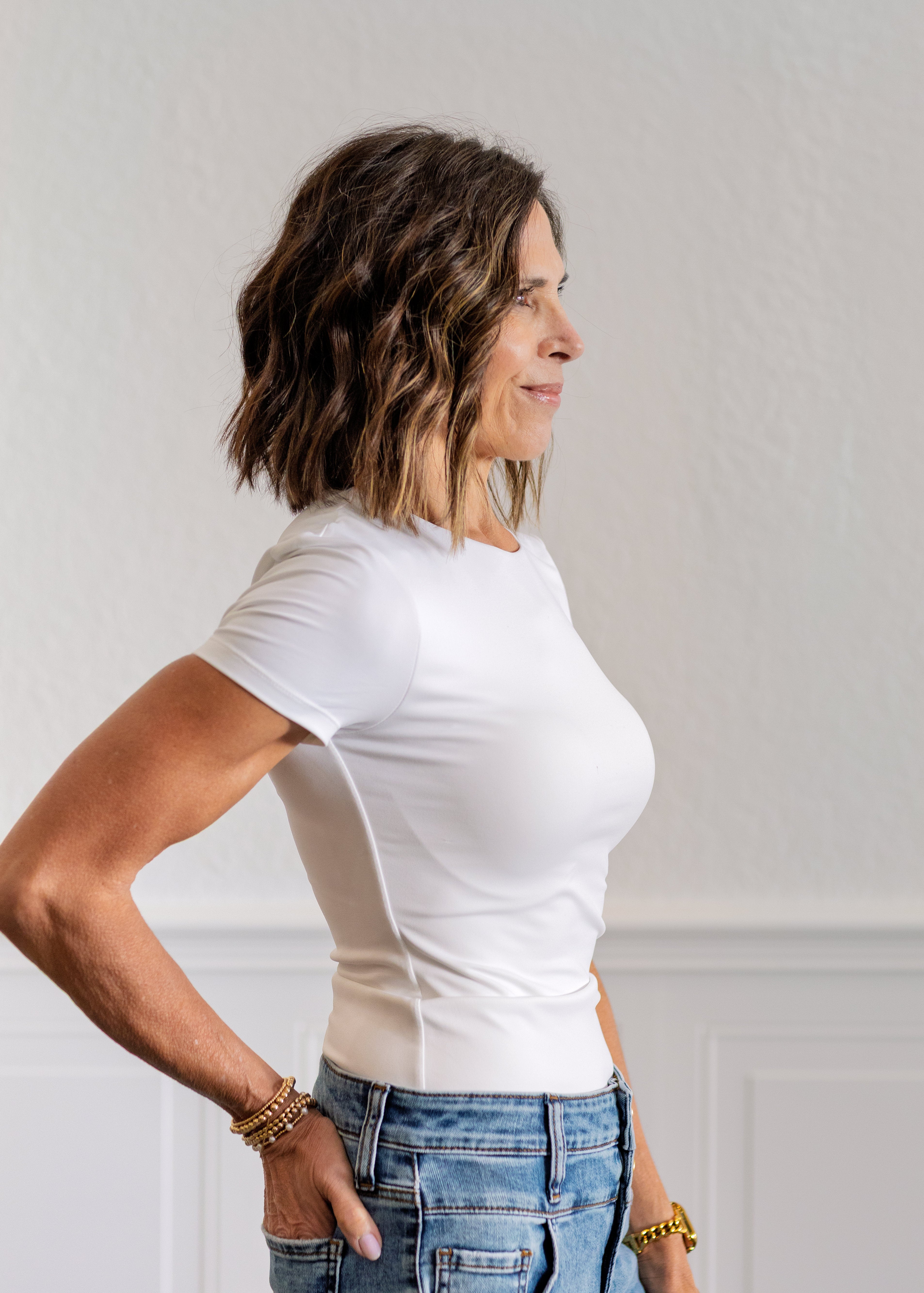 The Roxi Tee is the kind of polished basic that instantly elevates your everyday wardrobe. Designed with a longer length, double-layer fabric, and a high crew neckline, this top offers a smooth, structured fit with the luxe second-skin feel you will want to wear on repeat. The ultra-flattering fabric creates a sleek, smoothing effect while still feeling soft, comfortable, and easy to move in.