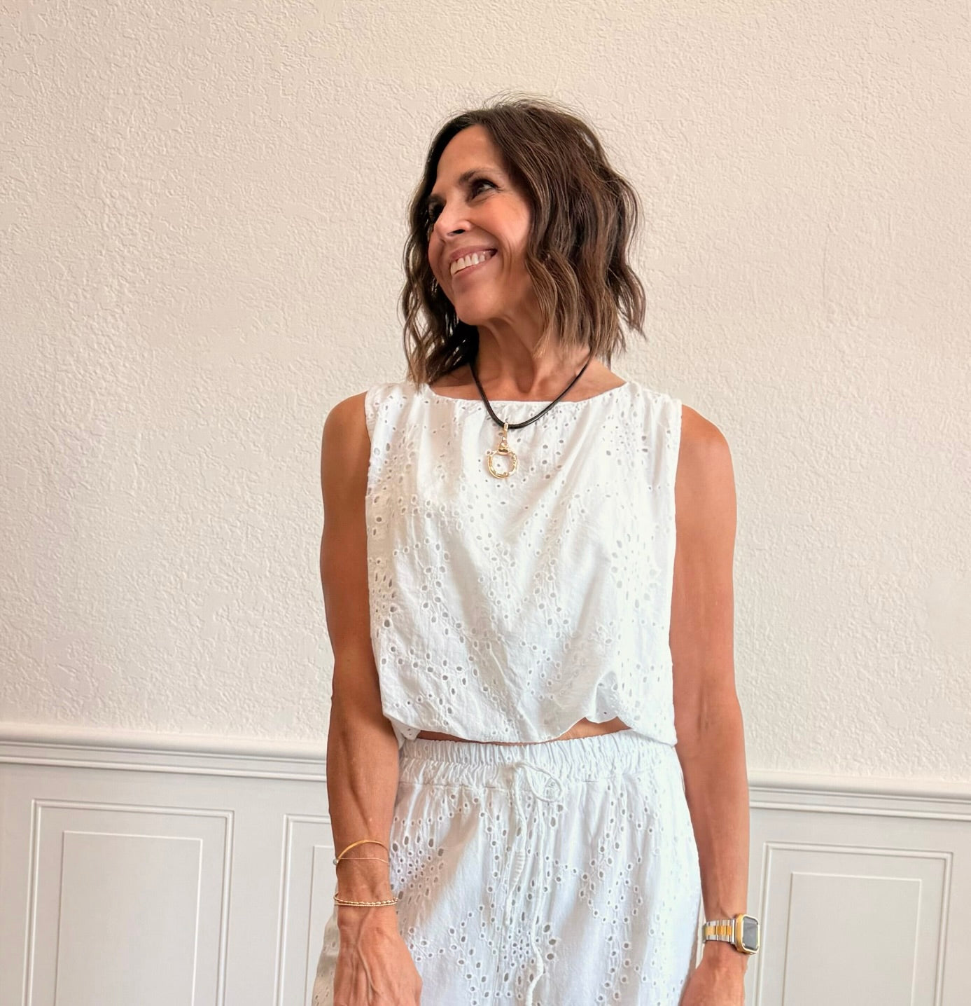 Fresh, feminine, and effortlessly polished, the Sleeveless Bubble Hem Eyelet Top in White is a standout piece with soft texture and elevated charm. Designed with a sleeveless silhouette, delicate eyelet detail, and a bubble hem finish, this top brings a flattering shape with a romantic boutique feel. The crisp white color keeps the look timeless and versatile, making it easy to style throughout the season.