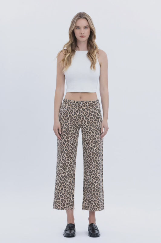 Make a bold statement with these high-rise animal print crop wide leg jeans. Crafted from comfortable stretch denim, they feature a flattering high-rise waist that elongates your silhouette and a cropped length perfect for showcasing your favorite footwear. The eye-catching animal print adds instant edge to any outfit, while the clean-cut raw hem delivers an effortlessly cool, contemporary vibe. The wide-leg cut offers freedom of movement without sacrificing style. Whether you're dressing up or down, these versatile jeans are your go-to piece for turning heads.