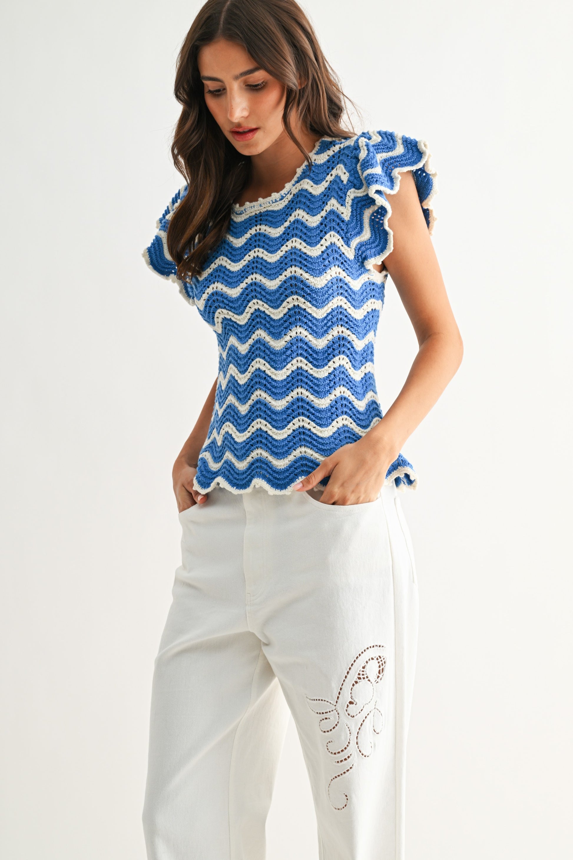 Elevate your everyday style with this stunning blue and white chevron knit top—where playful sophistication meets wearable art. The dynamic wave pattern catches the eye with visual intrigue, while hand-finished ruffled sleeves bring an unexpected twist of elegance. Perfect for professionals who refuse to compromise on personality, this thoughtfully crafted piece transitions seamlessly from office to weekend adventures. Quality construction ensures this becomes a go-to favorite you'll reach for again and again.