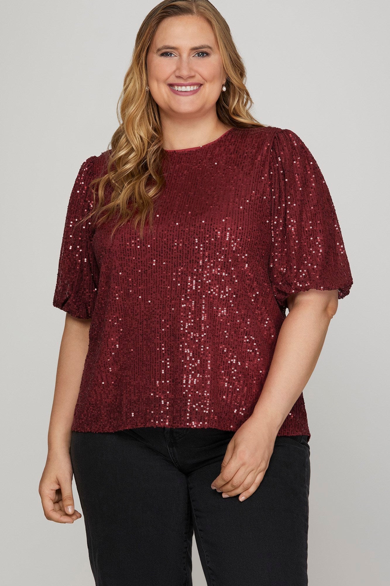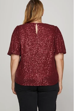 Indulge in glamour with our Curvy Puff Sleeve Sequin Top! Featuring half puff sleeves and sparkling sequins, this top will elevate your look for a night out. With a flattering fit, you'll feel confident and chic. Don't miss out on this must-have statement piece!