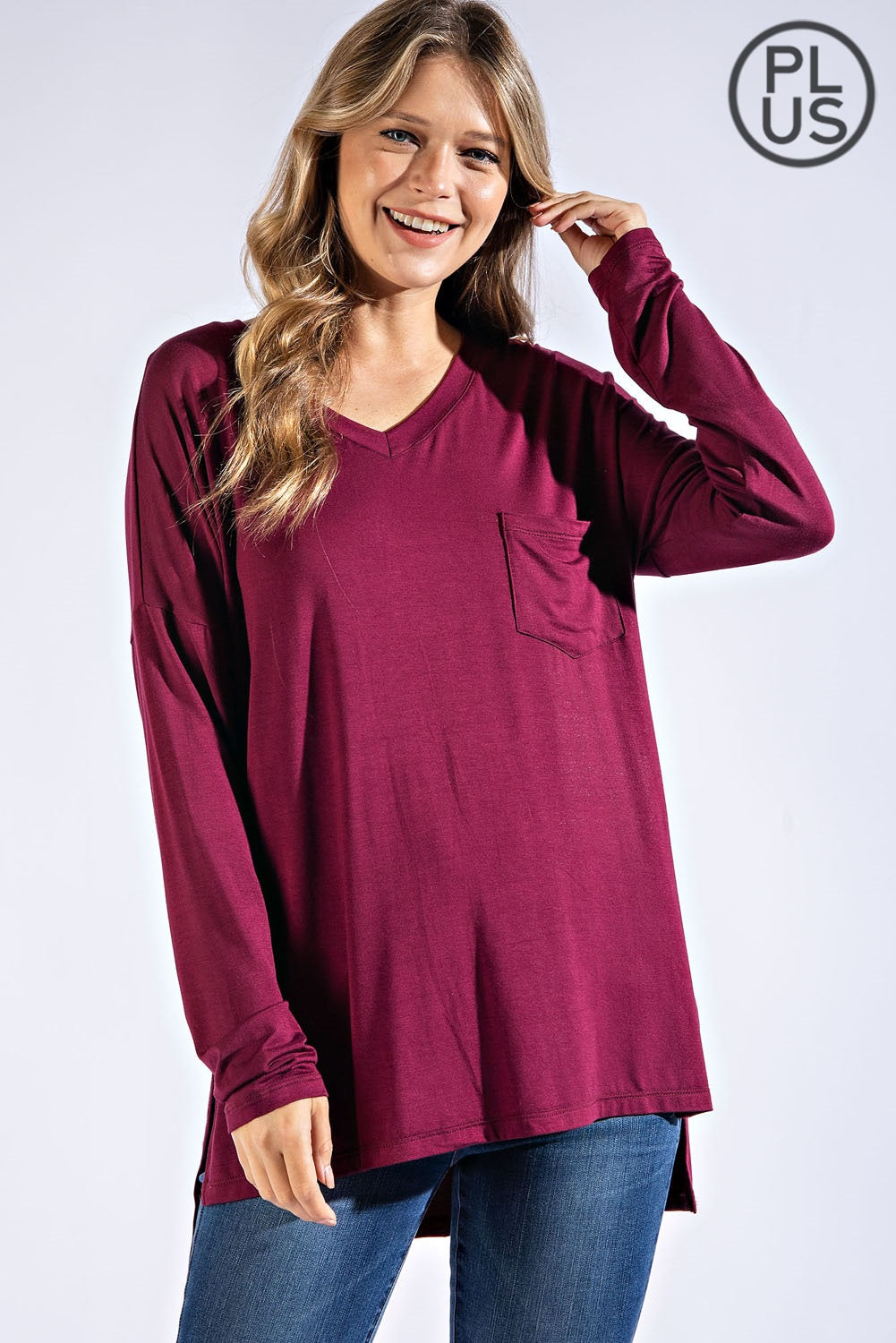 Elevate your wardrobe with our sophisticated Curvy V-Neck Long Sleeve Top. This stylish piece features a flattering V-neck, functional pocket, and elegant side slit. Made for plus-size beauties, it also boasts a high-low hemline for a touch of luxury. Perfect for any occasion, it's both versatile and chic.