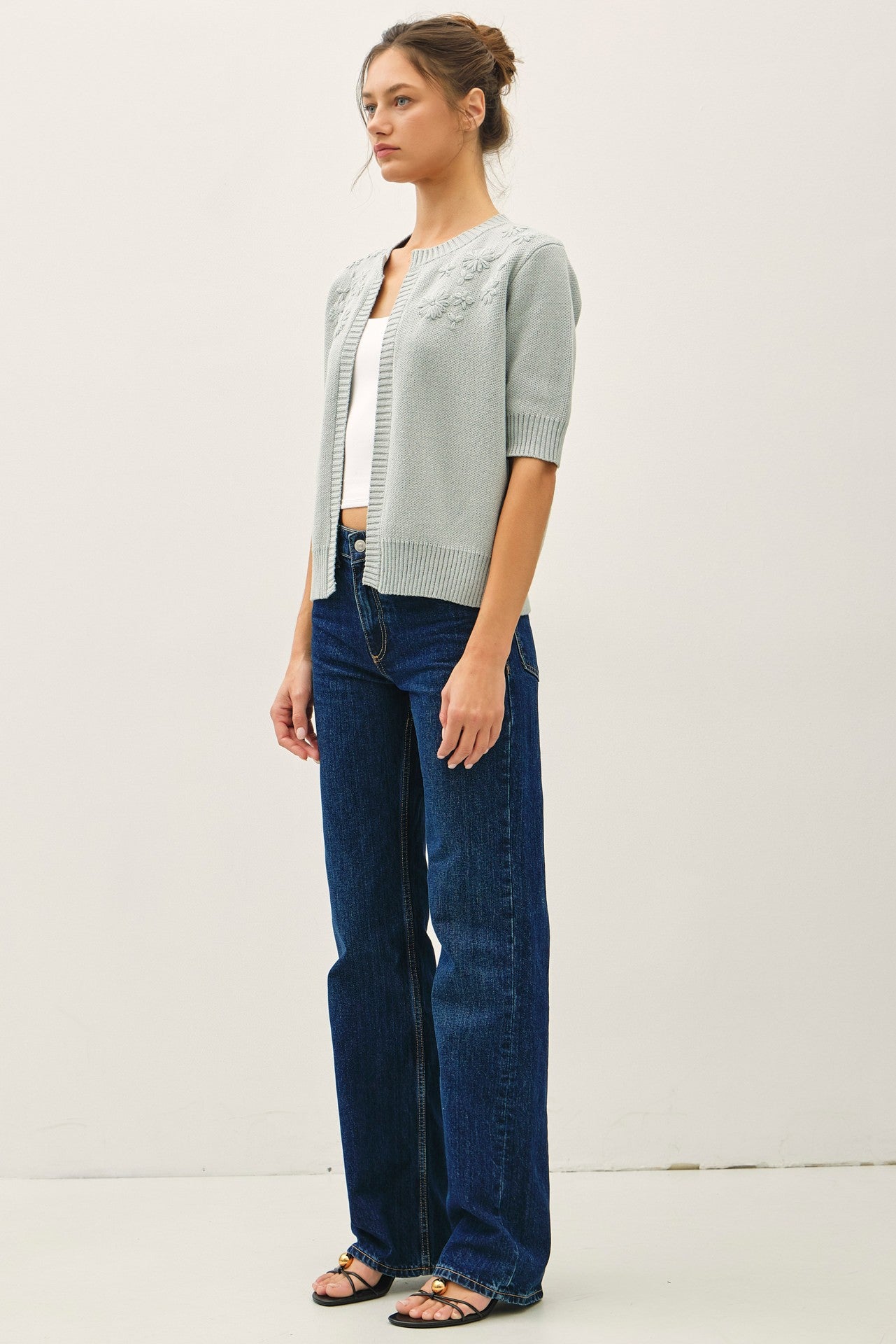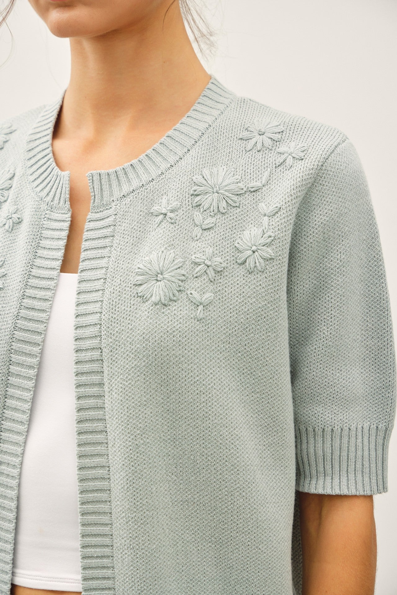 Brighten your wardrobe with this charming daisy embroidery knit cardigan. Featuring delicate floral details, an open front design, and short sleeves, it's perfect for layering over your favorite tees. The round neckline and ribbed edges provide a polished finish, while the above-hip length keeps things effortlessly chic. Cozy, cute, and ready to become your go-to piece for casual days.