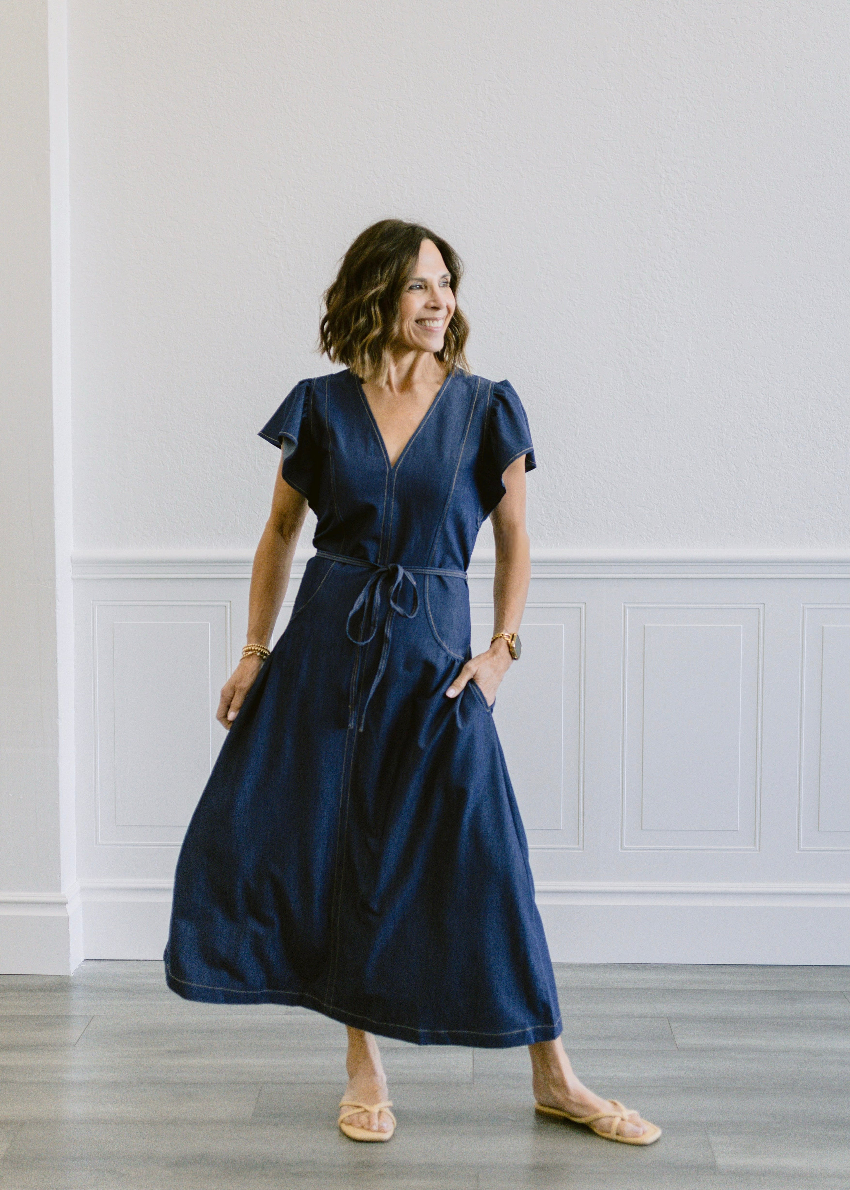Effortless style meets comfort in this denim washed dress. Featuring a flattering V-neckline and ruffled short sleeves, the design showcases gathered details throughout for added dimension. A self-tie waist belt cinches the silhouette while functional side pockets offer everyday practicality. Care for your dress gently—wash on a delicate cycle in cold water to maintain its beautiful finish.