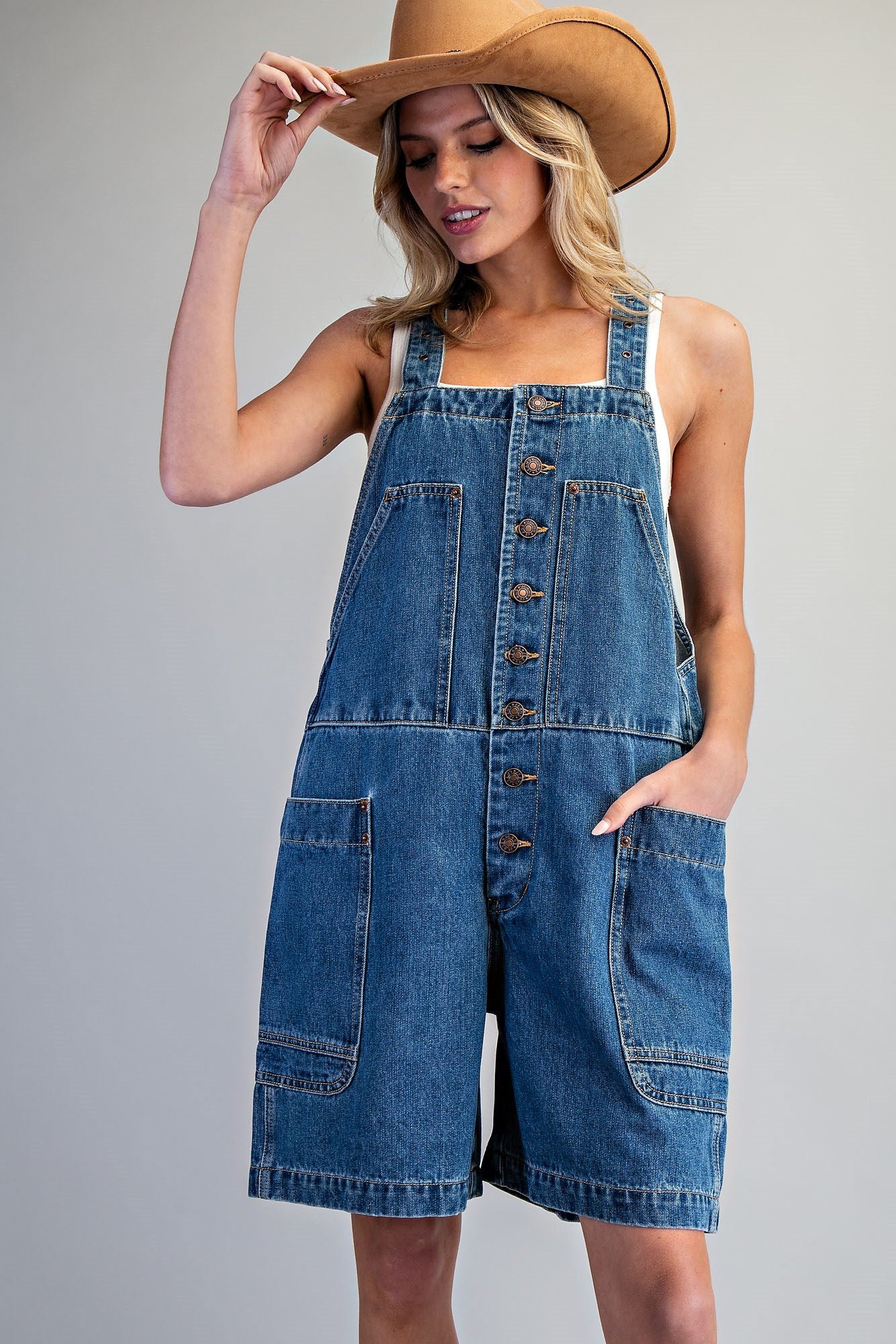 Throw on this Front Button Denim Romper and embrace your inner adventurer! Adjustable shoulder straps let you dial in the perfect fit, while the button-down front bib keeps things practical and fun. Oversized cargo pockets are ready for all your essentials, and chest patch pockets add that utility-chic vibe. The relaxed knee-length cut gives you freedom to move, whether you're exploring the city or just vibing with friends. Casual, comfortable, and totally on-trend.