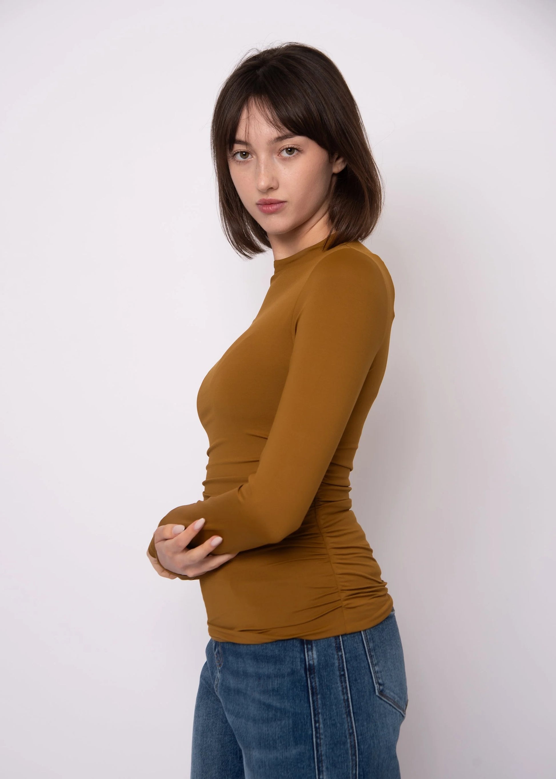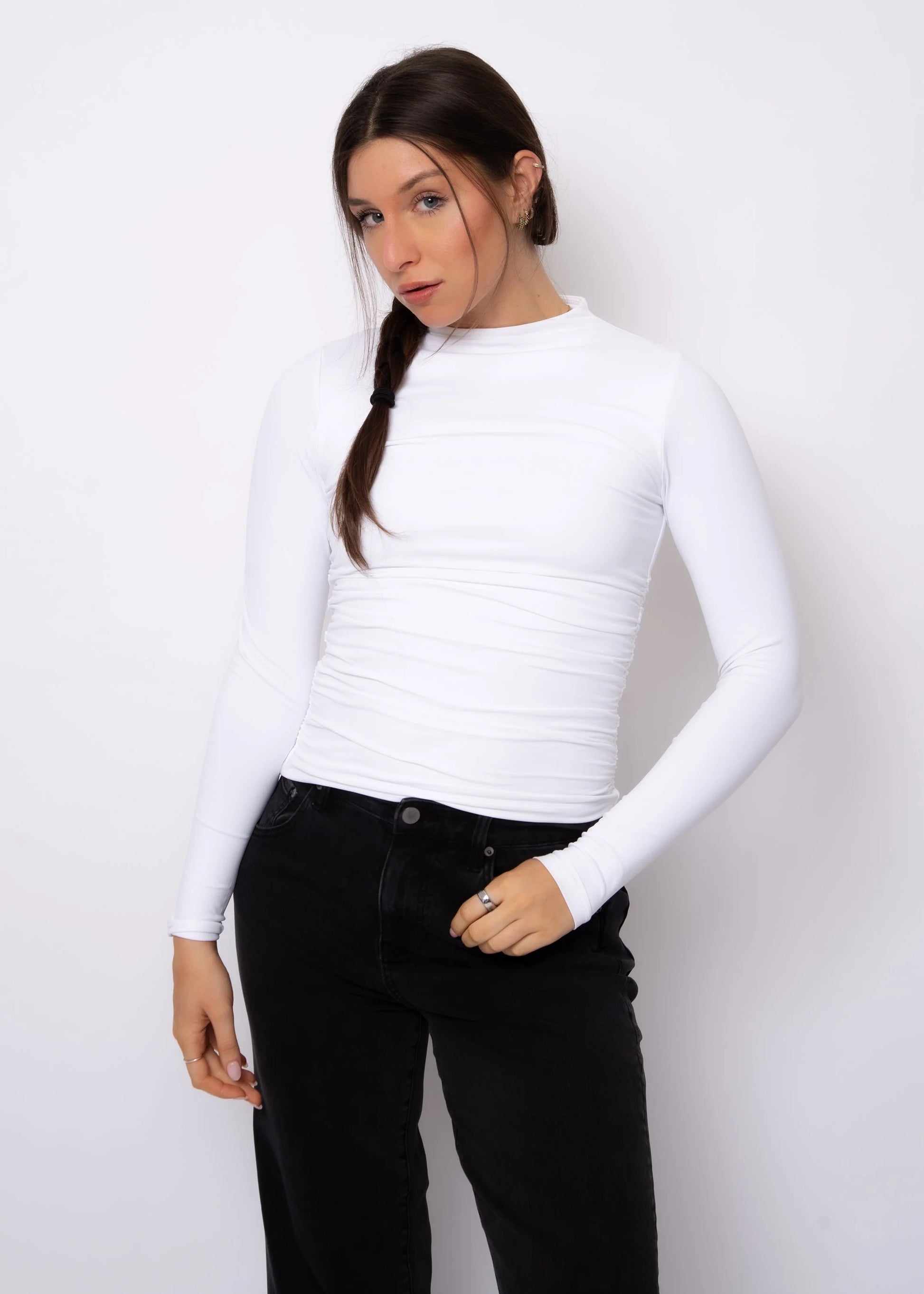 Elevate your wardrobe with the Long Sleeve Funnel Neck Ruched Top. Rivaling Spanx in quality this top features a sleek funnel neckline and extended sleeves, this top redefines the classic tank with a modern edge. The side ruching enhances your silhouette, while the ultra-soft, stretchy fabric offers a comfortable, second-skin fit. Perfect for pairing with high-waisted jeans or layering under a blazer, this top adds a bold, sophisticated touch to any outfit.