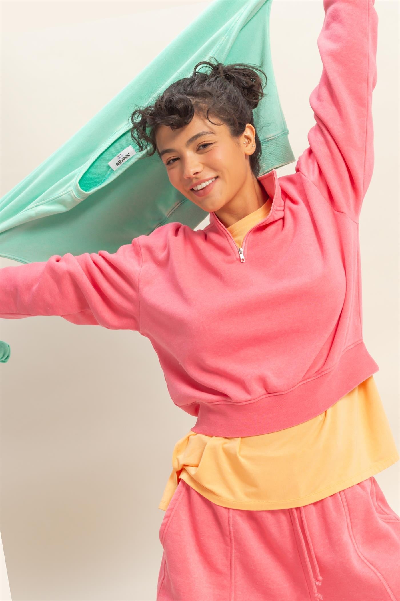 Sink into comfort with this burnout washed french terry pullover—soft, textured, and effortlessly cool. The high stand collar and half-zip closure give you easy layering options, while drop-shoulder sleeves and ribbed cuffs keep things relaxed and refined. Cut slightly cropped with a laid-back fit, it's the perfect piece to throw on. Style it with matching fleece joggers for that cozy-casual vibe that just works.