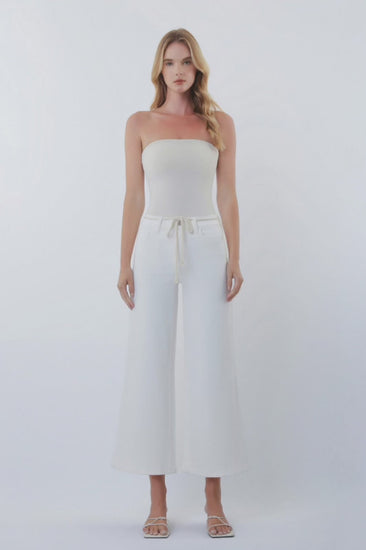 Elevate your denim game with these high-rise optic white wide-leg jeans that blend comfort with effortless style. Crafted from comfort stretch denim, they feature a drawstring waistband for a customizable fit, classic five-pocket construction, and a cropped length that hits just right. The finished hem and relaxed wide-leg silhouette create that coveted laid-back vibe while keeping you feeling supported all day long. Perfect for dressing up or down, these jeans are your new go-to for casual cool.
