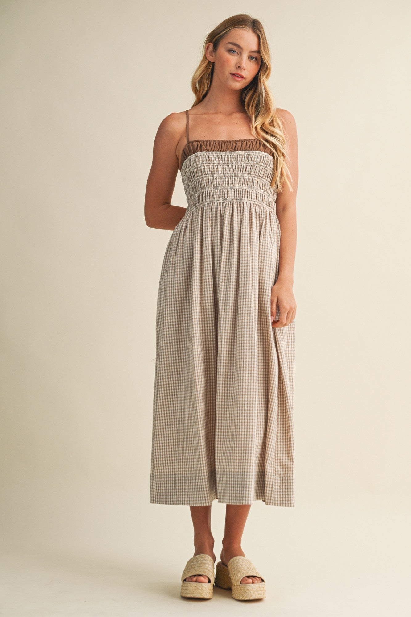 Playful gingham charm meets practical style in this midi dress. Adjustable straps let you customize the fit, while hidden side pockets keep your essentials close. The layered silhouette adds dimension and movement, making it perfect for everything from casual outings to weekend adventures. Effortless, fun, and functional.