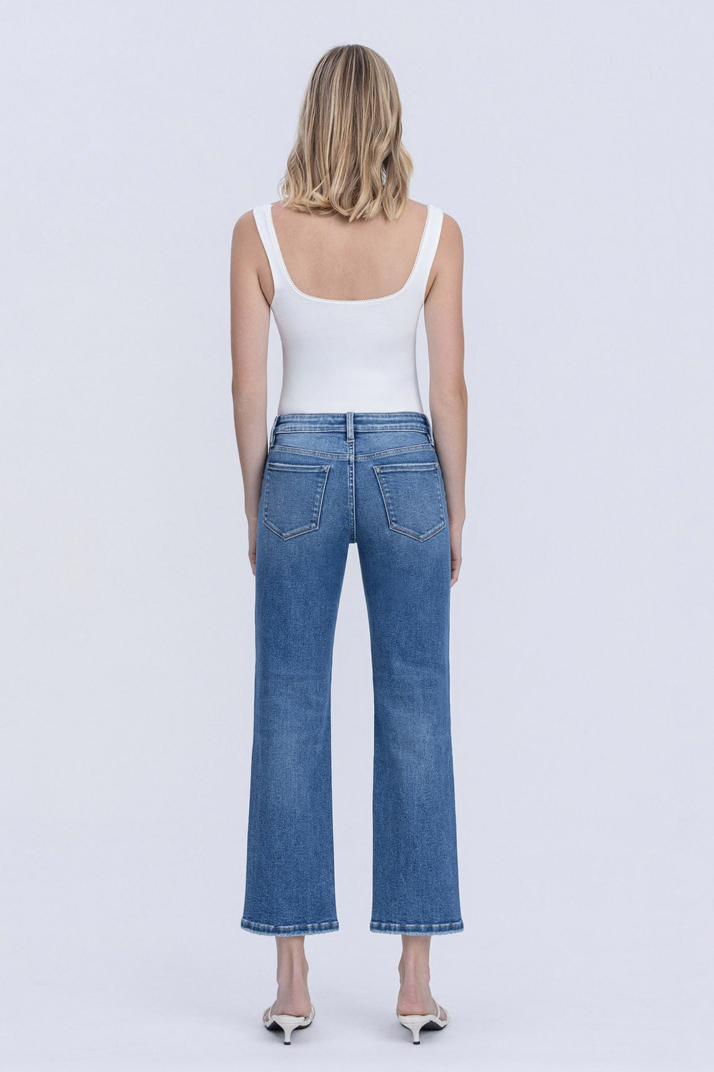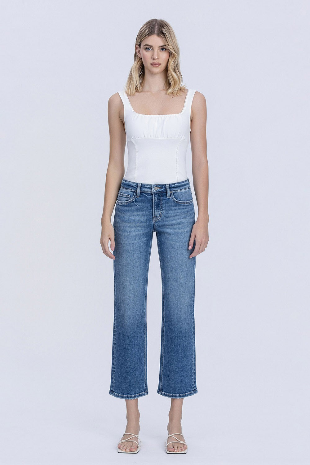 Effortless style meets everyday comfort in these mid-rise straight jeans. Crafted with a comfort stretch fabric, they move with you while maintaining their shape. The medium dark wash pairs perfectly with anything in your closet, while the finished hem and ankle length create a polished, modern silhouette. Five functional pockets keep your essentials close, and the straight leg never goes out of style. Your new go-to pair for looking put-together without trying too hard.