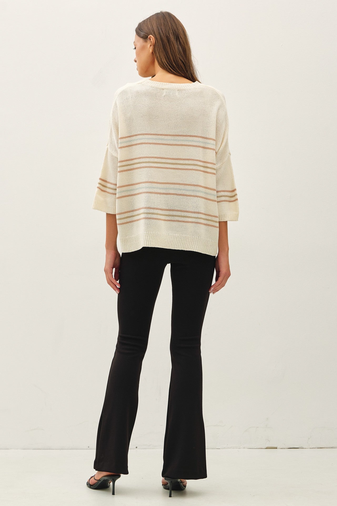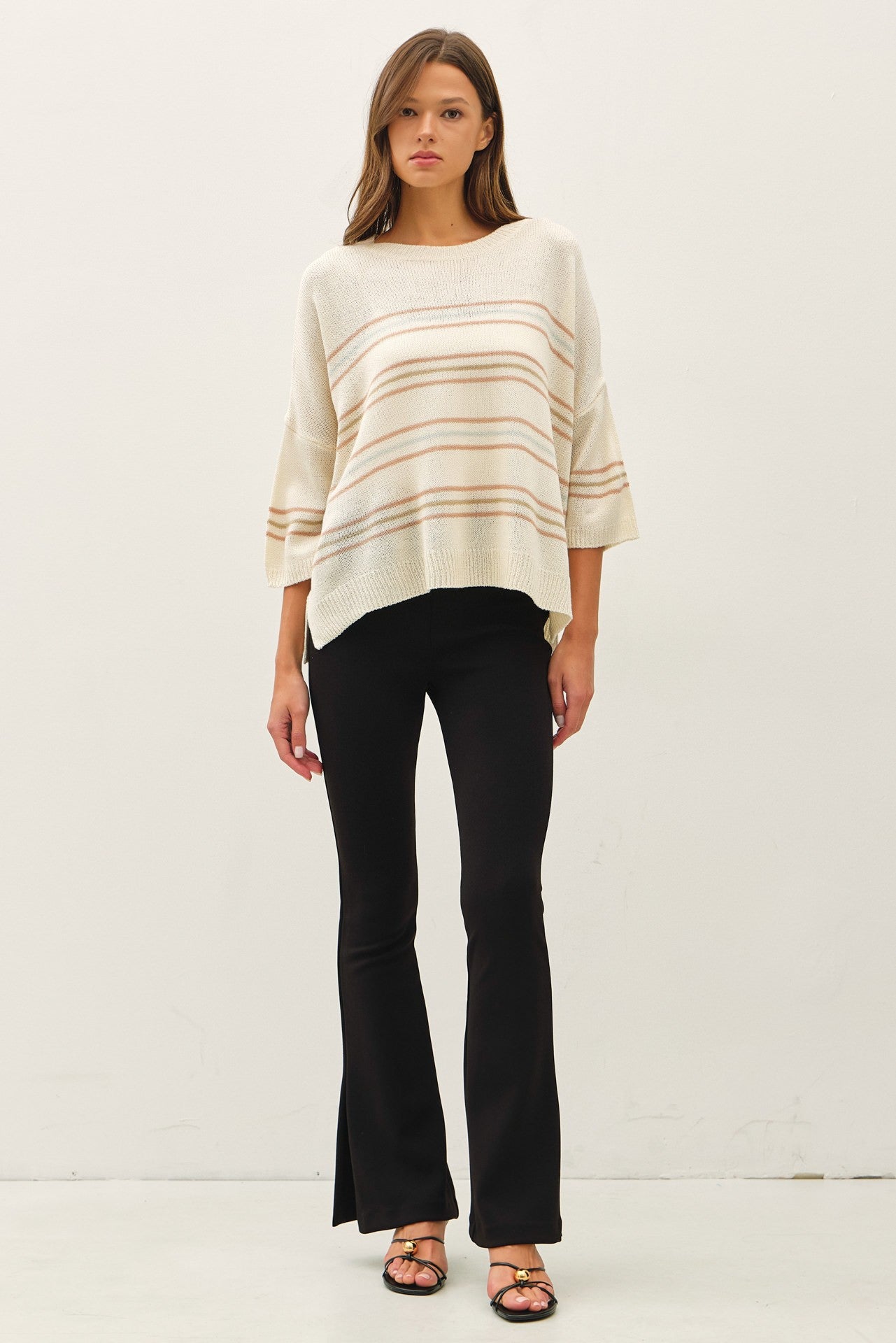 Effortlessly cool and undeniably comfy, this striped pullover brings laid-back vibes to your everyday rotation. The oversized, boxy silhouette pairs perfectly with drop shoulders and roomy sleeves that hit at the elbow, while ribbed hems keep everything polished. A playful side slit adds movement, and the lightweight fabric makes it ideal for layering or wearing solo. Round neckline, endless styling possibilities—this is your new casual essential.
