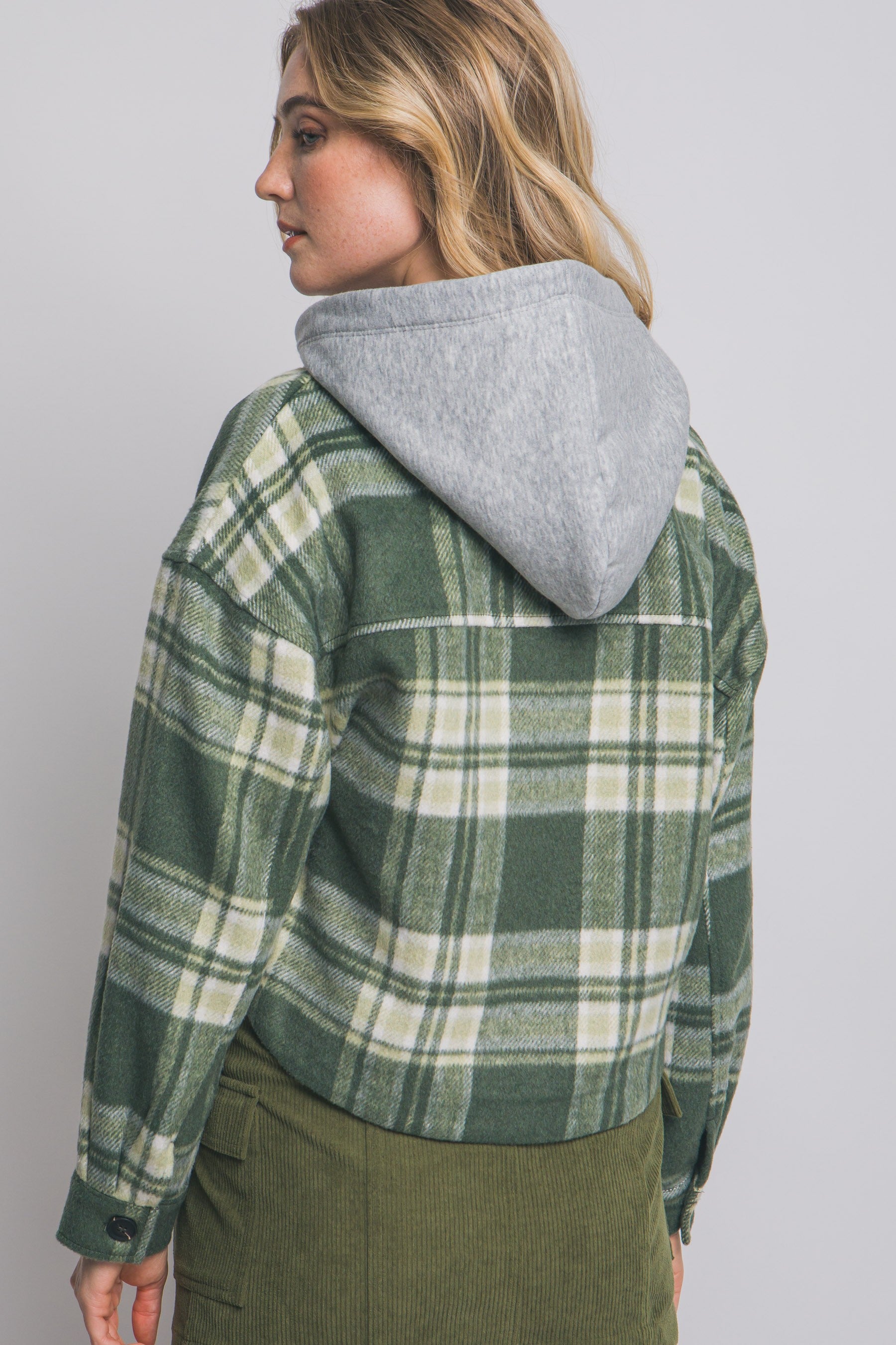 This Plaid Shacket combines style and practicality with its button-up closure and two front pockets, perfect for keeping essentials close. The detachable hood adds versatility, letting you adapt your look and comfort throughout the day. Its cropped fit offers a modern edge, making it an ideal layering piece for any season.