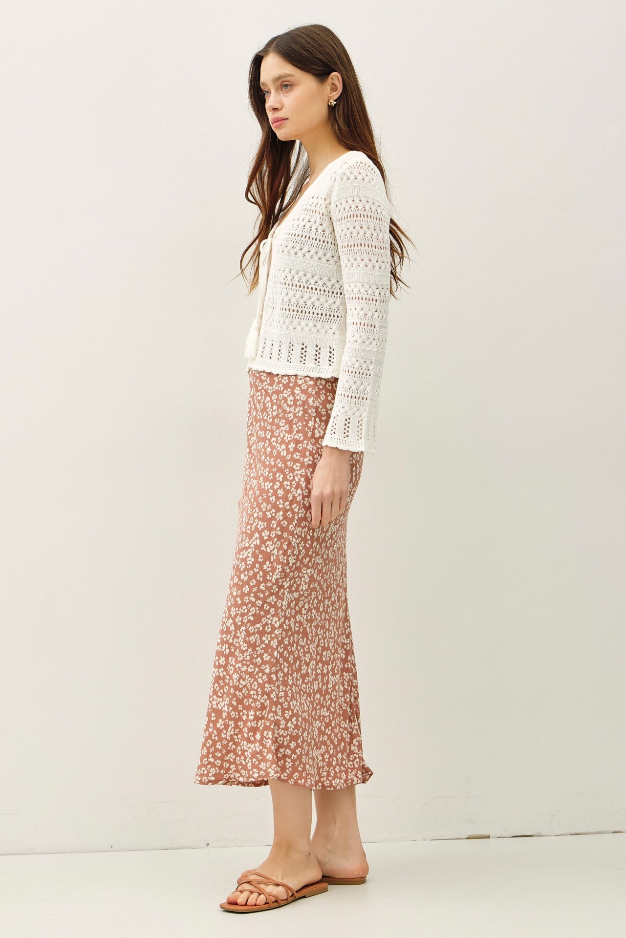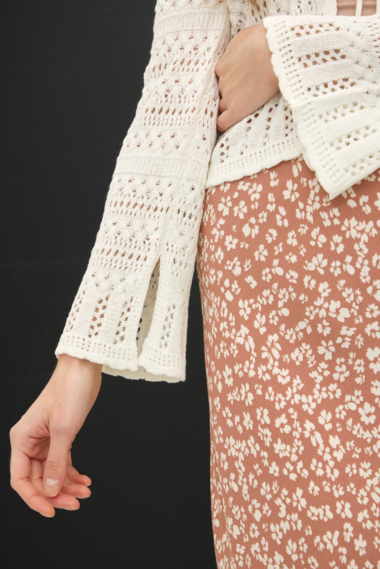 Slip into effortless elegance with this pointelle knit cardigan—a lightweight layer that's as charming as it is versatile. Delicate scallop edges frame the front, while ribbed detailing at the cuff, neck, and hem keeps everything polished. The ribbon tie cinches your silhouette, and graceful bell sleeves add a touch of whimsy to any outfit. Perfect for layering over dresses or pairing with your favorite tee.
