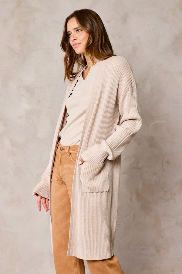 Experience comfort and style with the Ribbed Long Cardigan. Crafted from soft knit fabric, it offers cozy warmth while maintaining a lightweight feel. The open front design ensures easy layering, and long sleeves provide full coverage for cooler days. Convenient patch pockets add a practical touch, perfect for keeping essentials close. Elevate your wardrobe with this versatile cardigan that blends effortless elegance and everyday comfort.