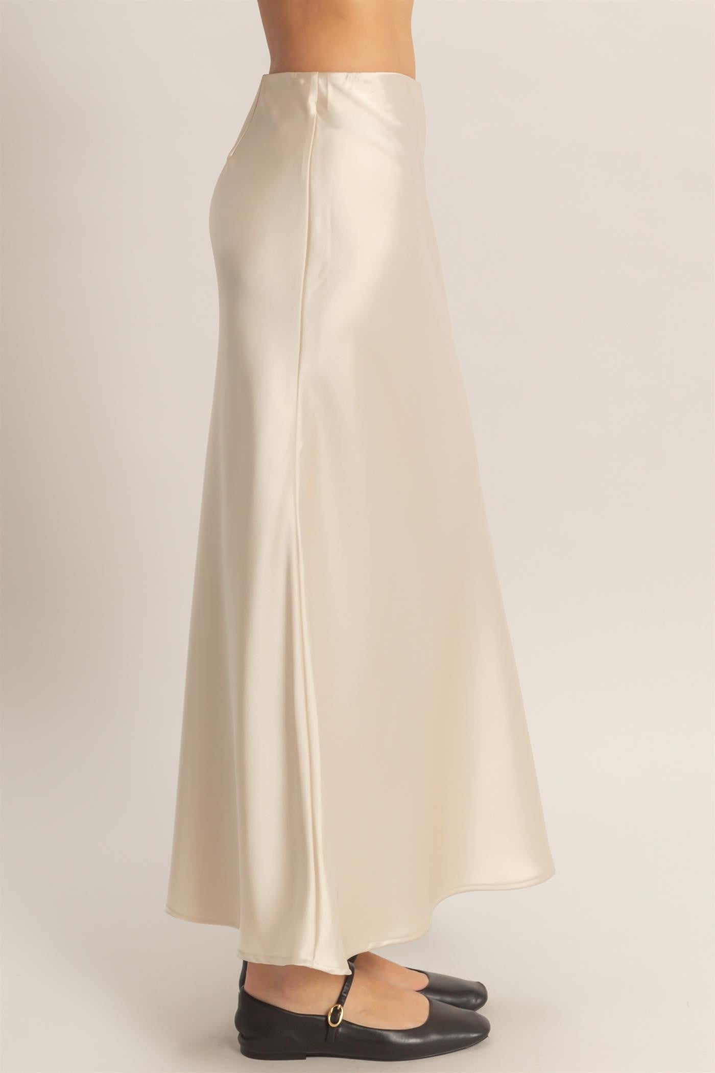 This luxurious satin skirt features a high-waisted fit and a sophisticated bias-draped A-line shape, giving it a subtle, flowing hemline. Pair with a fitted silk blouse and stiletto heels for a chic, polished, and undeniably sophisticated evening ensemble.