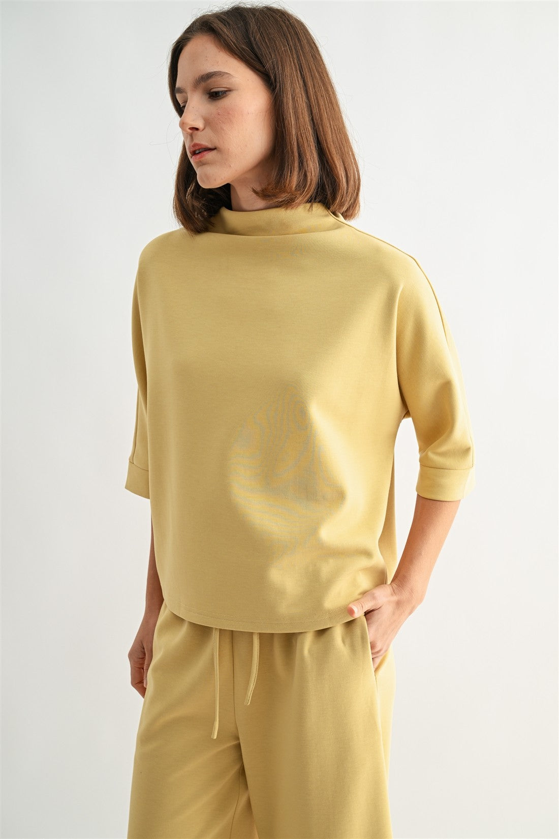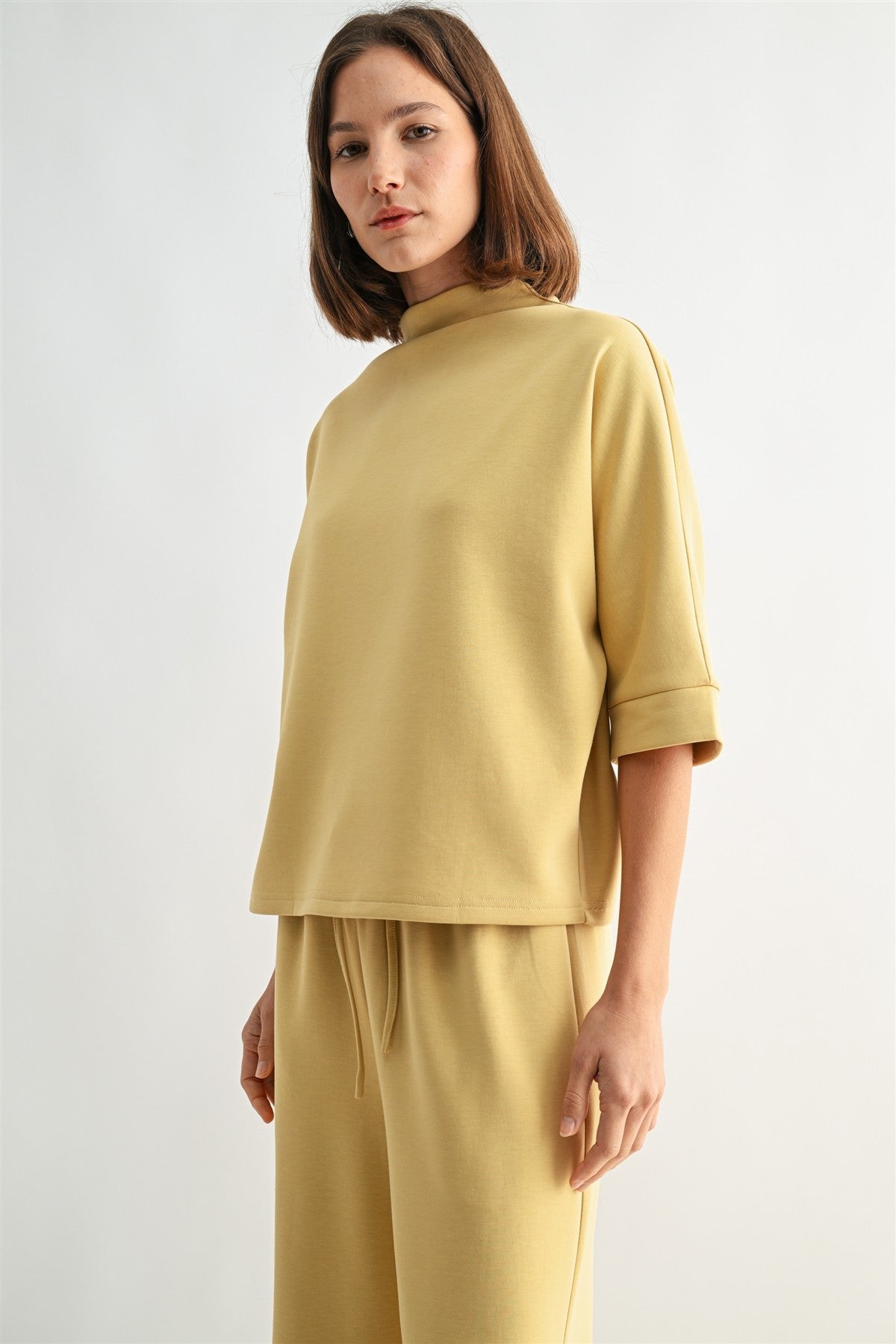 Experience effortless style and comfort with the Scuba Mock Neck Knit Top in Charcoal. Its relaxed fit and 3/4 sleeves offer a flattering silhouette that's perfect for layering or wearing on its own. The mock neck adds a touch of sophistication, making it ideal for both casual and polished looks. Elevate your wardrobe with this versatile knit top designed to keep you comfortable all day long. Paired with the Scuba Pants in Charcoal.