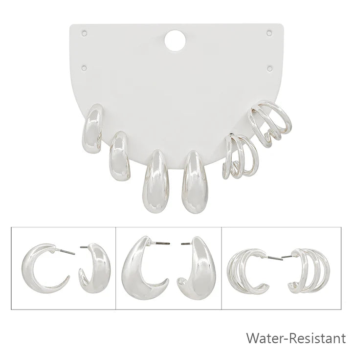 Elevate your ear game with this trio of timeless gold or silver hoops that refuse to quit. Each delicate .5" hoop brings just the right amount of sparkle without the drama, and they're water-resistant so you can wear them poolside, in the shower, or through whatever adventure comes your way. Mix, match, or stack them—these versatile beauties work solo or as a set. Simple, chic, and ready for anything.