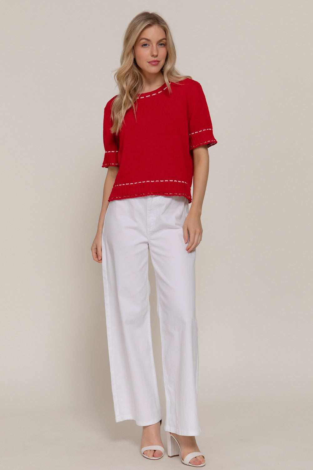 Lightweight and laid-back, this short sleeve sweater brings effortless style to your everyday rotation. The classic round neckline pairs perfectly with eye-catching contrasting stitching that adds a pop of personality to a timeless silhouette. Layer it over a tee or wear it solo—versatile enough for casual weekends and relaxed office vibes. A wardrobe essential that works as hard as you do.
