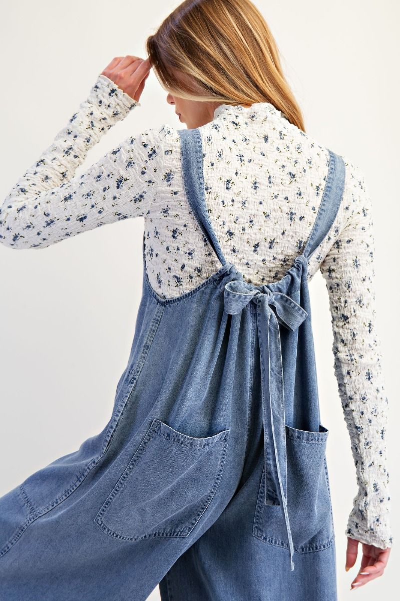 Embrace effortless style with these washed denim overalls, designed for a relaxed, contemporary fit. The wide-leg silhouette and cropped length create a flattering, modern profile, while adjustable tie-back straps ensure a customized fit. Gathered detailing at the neckline adds visual interest and dimension. Practical side pockets keep essentials within reach. Perfect for layering or wearing solo, these versatile overalls transition seamlessly from casual outings to creative endeavors.